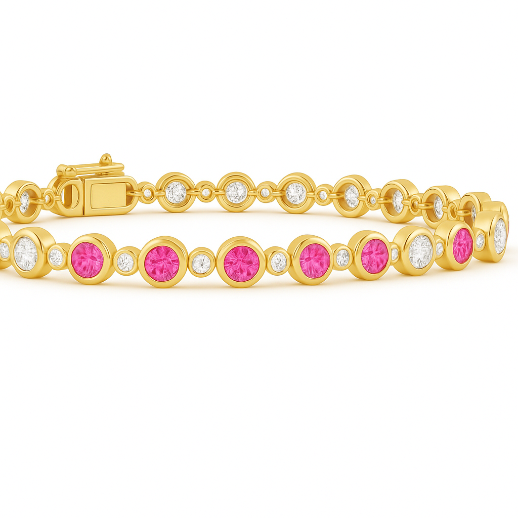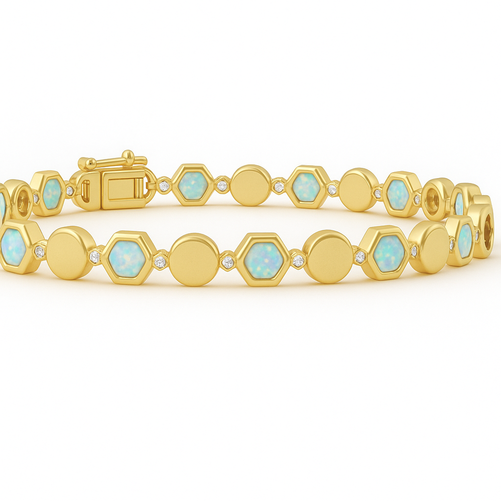 Each rich dark brown gemstone is a drop of chocolate: bold, comforting, and elegant. Nestled between crisp white diamonds and brushed champagne gold discs, this bracelet captures the balance of soft and sweet, but solid gold.